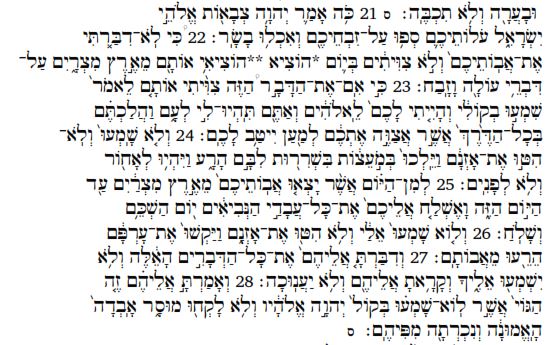 Aggiungete olocausti a sacrifici e mangiate pure la carne sacrificale (cfr. nota 15). In verità io non parlai ne’ diedi comandi sull’olocausto e sul sacrificio ai vostri padri [quando li feci uscire dall’Egitto] (cfr. nota 16). Questo fu la Parola che diedi loro, “Ascoltate la mia voce, Io sarò il vostro Dio e voi sarete il mio popolo. Camminate sempre sulla strada che vi prescriverò perché siate felici”. Ma non ascoltarono né diedero retta [seguivano i loro piani] (cfr. nota 17), la malvagità del loro cuore ostinato [volgendomi le spalle e non il volto] (cfr. nota 18). Da quando i vostri padri uscirono dall’egitto fino ad oggi, Io inviai a voi i miei servitori i profeti con premura e sempre. Ma non mi ascoltarono, e non li ascoltarono né prestarono orecchio, resero dura la loro nuca divennero peggiori dei loro Padri. [Puoi ripetergli queste Parole, non ascolteranno. Puoi gridargli, non risponderanno (cfr. nota ]19). Puoi dirgli,“Ecco la gente che non ubbidì al JHWH, suo [Dio] (cfr. nota 20)”. Non vogliono correggersi la sincerità è [sparita] dalla loro bocca.